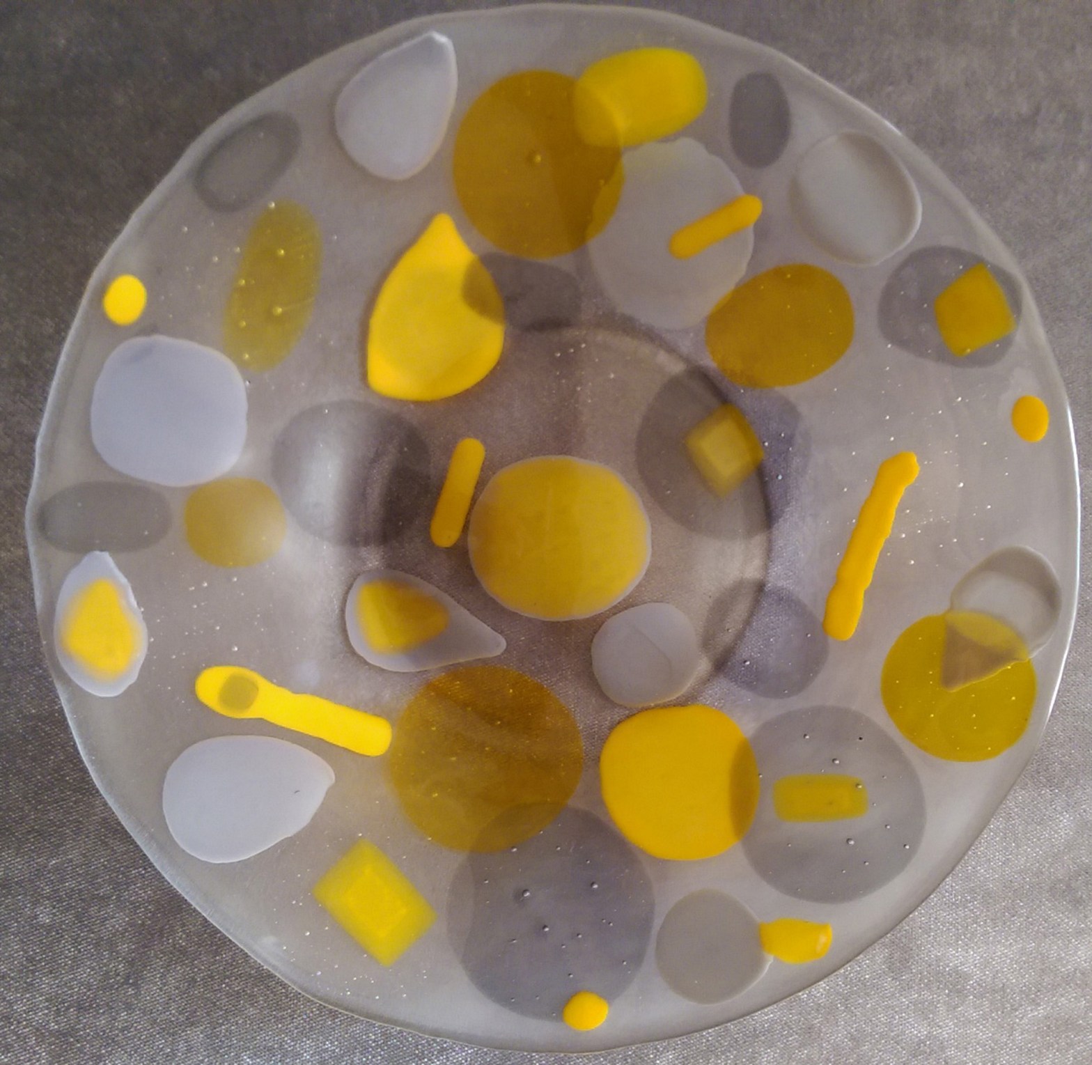 This bowl was made with pressed glass fired onto a 3mm base glass. The shapes in the final piece did not look like this going into the kiln! Always so much fun to be had fusing glass x