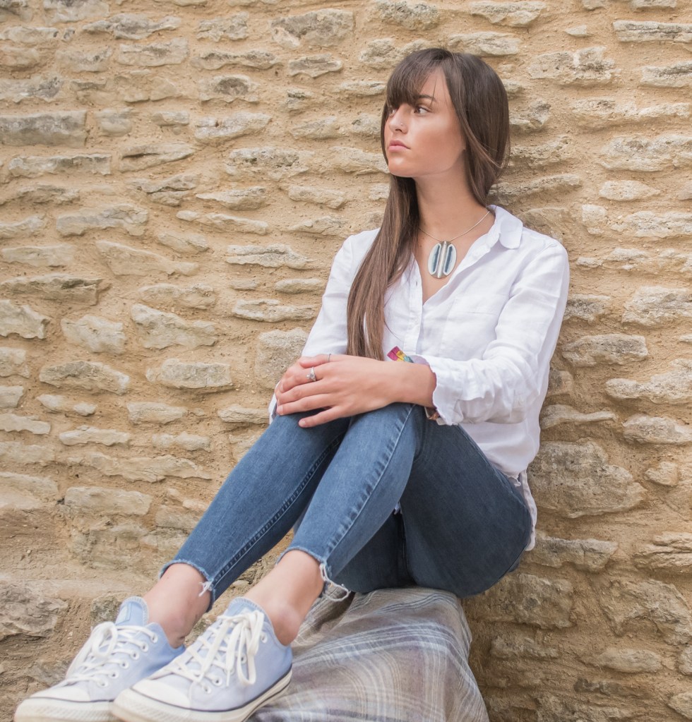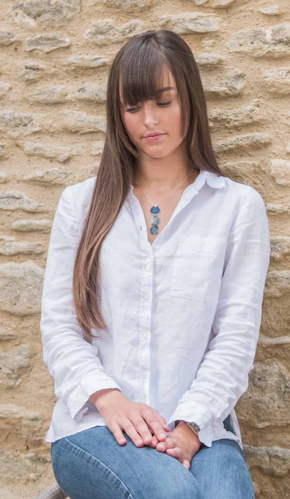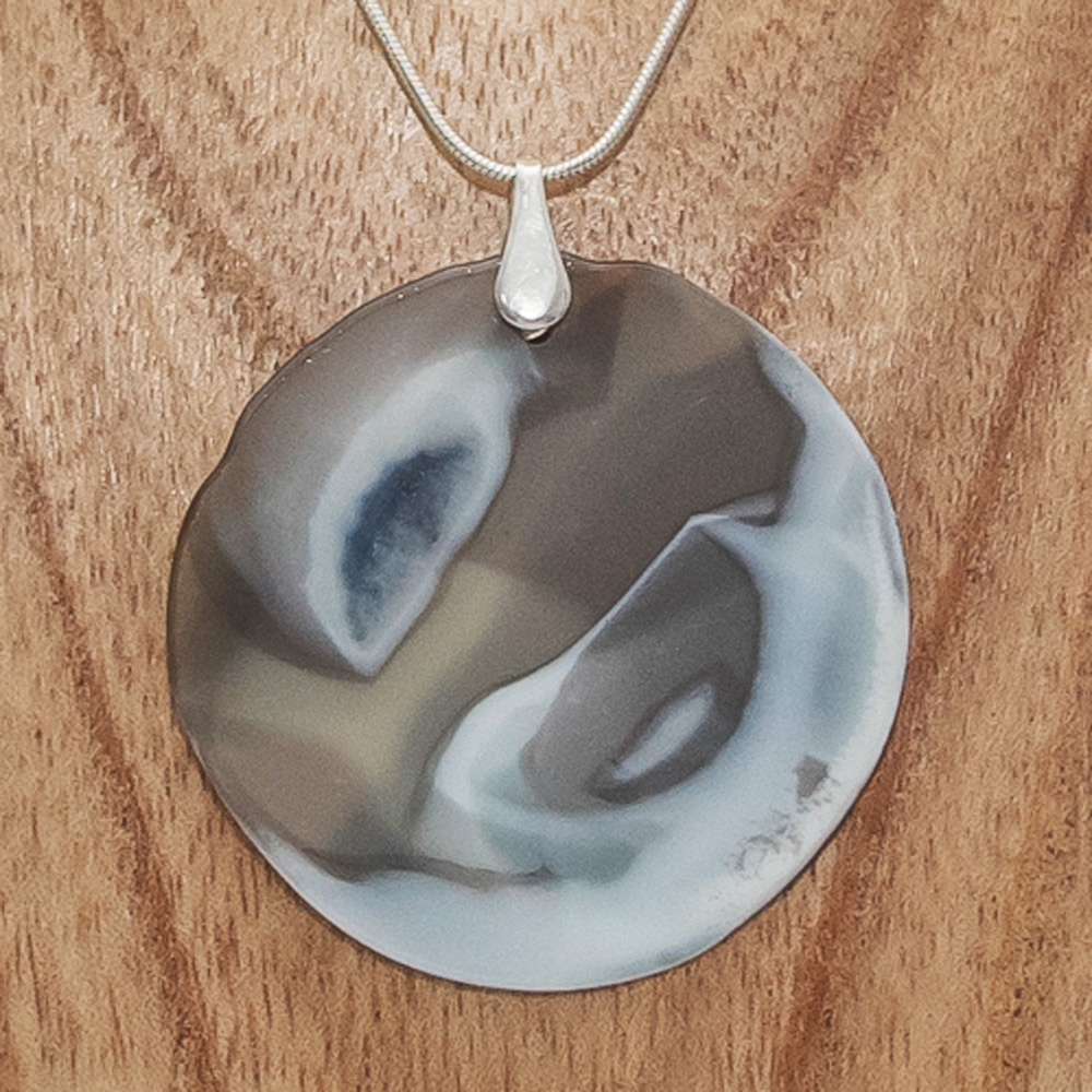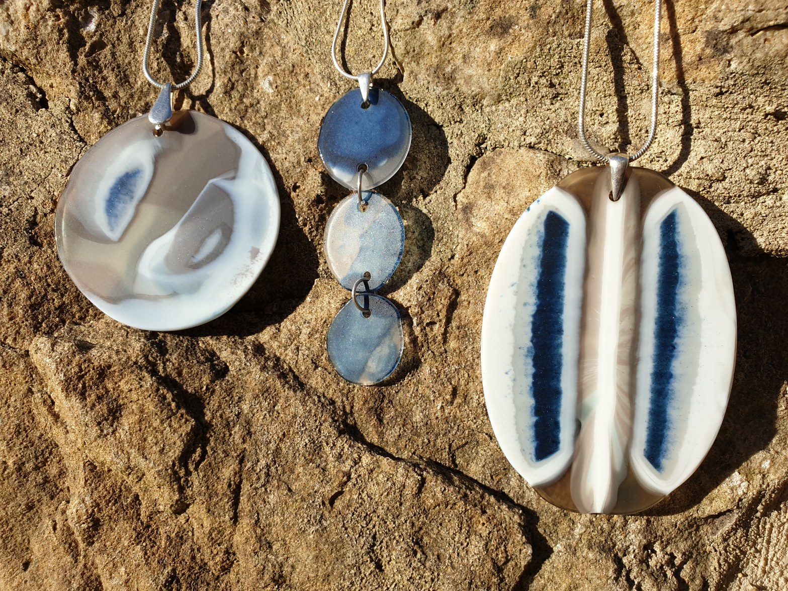 Each piece of my Origin range is unique. Made from blue, white and bronze glass with sterling silver . Beautifully light weight and oh so smooth.